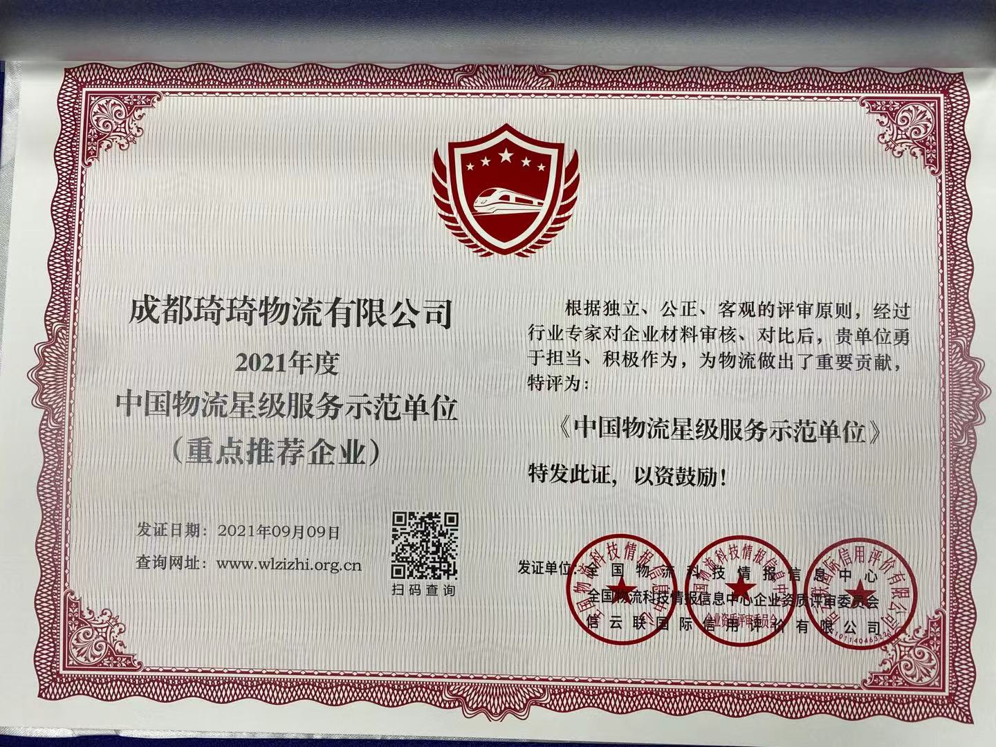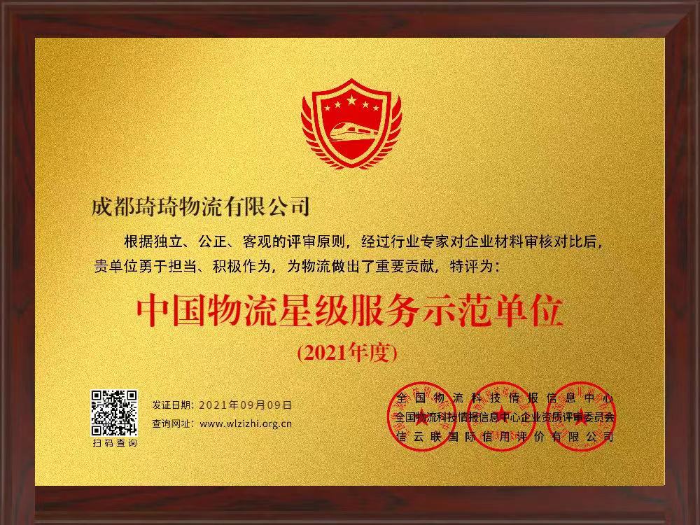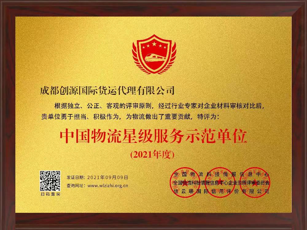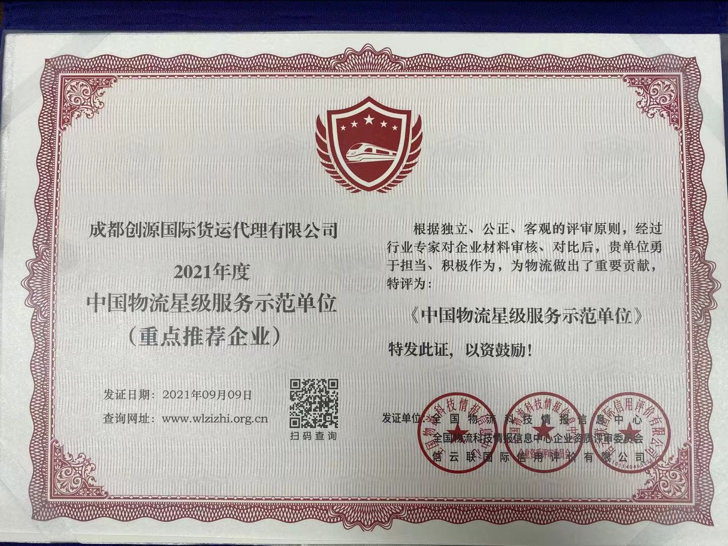 我司成都創(chuàng)源國際貨運代理有限公司及子公司成都琦琦物流有限公司在物流行業(yè)的貢獻(xiàn)突出 成功榮獲2021年度物流星級服務(wù)示范單位 。