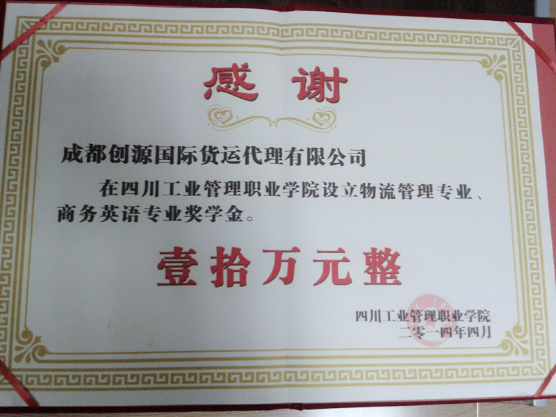 成都創(chuàng)源國際貨運代理有限公司為四川工業(yè)管理職業(yè)學院工商管理系物流管理專業(yè)和商務英語專業(yè)學生設立的專項獎學金,有利于推動四川工業(yè)管理職業(yè)學院物流管理專業(yè)人才培養(yǎng),激勵品學兼優(yōu)的學生刻苦學習,奮發(fā)成才。