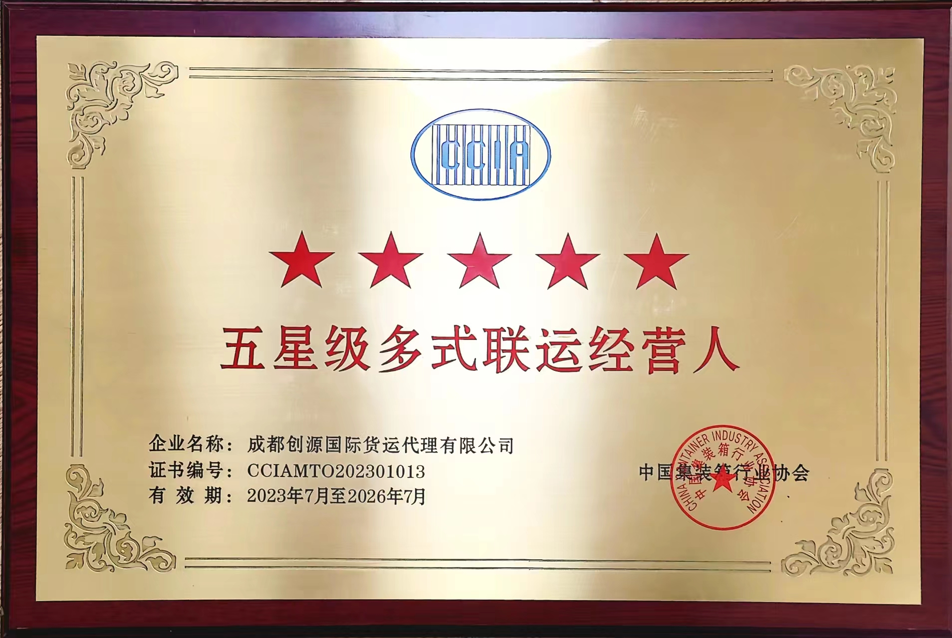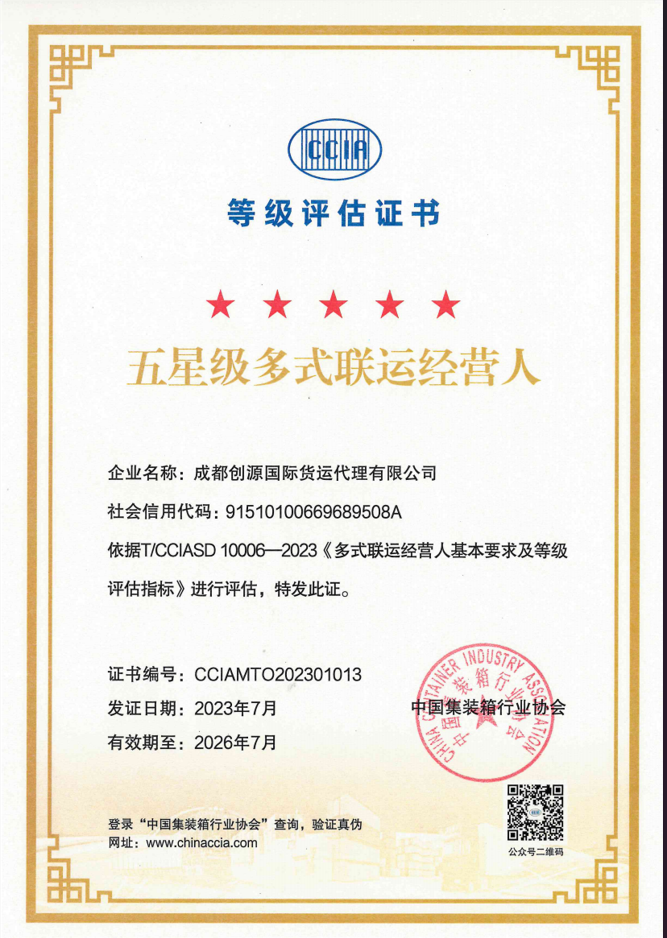熱烈祝賀成都創(chuàng)源國際貨運公司榮獲國家首批“五星級多式聯(lián)運經(jīng)營人”資質(zhì)
