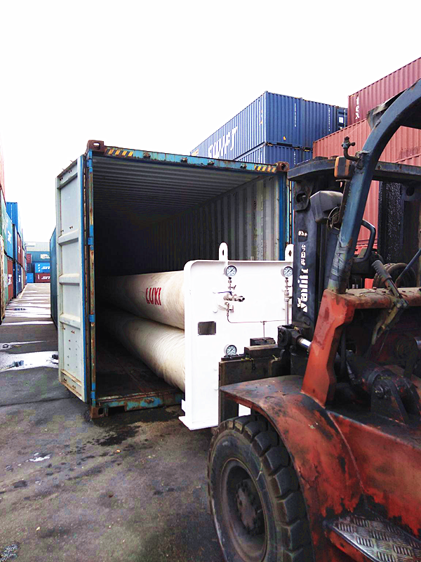 5.操作6噸叉車把儲(chǔ)氣罐推進(jìn)集裝箱:為避免損壞儲(chǔ)氣罐上壓力儀表,在叉車叉腳與儲(chǔ)氣罐底座之間放置木塊,緩慢進(jìn)叉,在叉車叉腳、木塊、儲(chǔ)氣罐底座接觸后,放低叉車叉腳將儲(chǔ)氣罐緩慢推進(jìn)集裝箱,理貨組同事觀察儲(chǔ)氣罐的進(jìn)箱位置指揮叉車司機(jī)進(jìn)行操作,防止儲(chǔ)氣罐與集裝箱箱壁接觸;