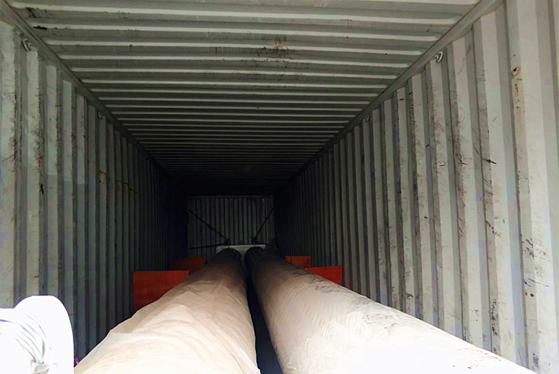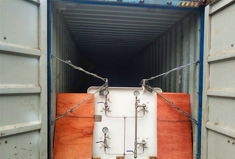 6.裝箱完成,指揮工人對(duì)儲(chǔ)氣罐按照鐵路發(fā)運(yùn)要求加固:在儲(chǔ)氣罐底座四周用木塊固定,在儲(chǔ)氣罐前后吊點(diǎn)處用4*4鐵絲上拉八字;